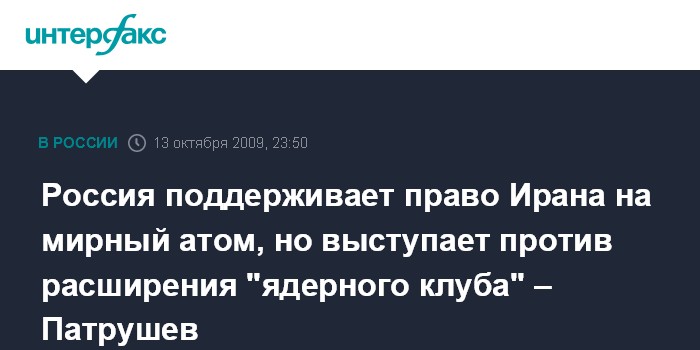 "Мы поддерживаем право Ирана на мирный атом, но категорически против дальнейшего расширения "ядерного клуба", - сказал Н.Патрушев в интервью газете "Известия", которое будет опубликовано в среду.
