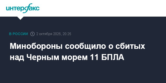 Москва. 2 октября. INTERFAX.RU - Средства противовоздушной обороны сбили 11 украинских беспилотников самолетного типа над Черным морем, сообщили в Минобороны.