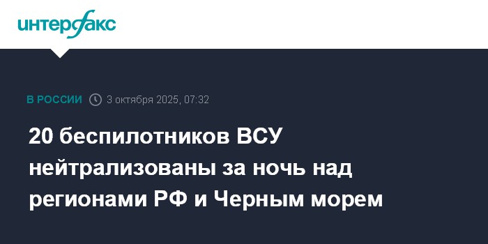 20 беспилотников ВСУ нейтрализованы за ночь над регионами РФ и Черным морем