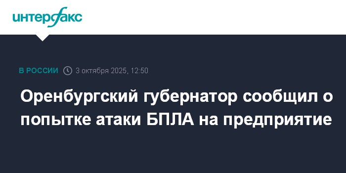 Москва. 3 октября. INTERFAX.RU - В Оренбургской области беспилотники пытались атаковать промышленный объект, сообщил в своем телеграм-канале губернатор региона Евгений Солнцев, не уточняя, что это за предприятие.