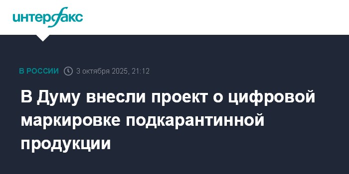Москва. 3 октября. INTERFAX.RU - Группа депутатов внесла в парламент законопроект, который вводит обязательную цифровую идентификацию и прослеживаемость партий подкарантинной продукции при ее ввозе в РФ, расширяет перечень информации для внесения в федеральную информационную систему в области карантина растений.