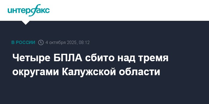 Москва. 4 октября. INTERFAX.RU - Губернатор Калужской области Владислав Шапша сообщил о четырех сбитых БПЛА над территориями Боровского, Кировского и Хвастовичского муниципальных округов.