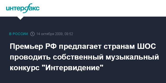 Москва. 14 октября. INTERFAX.RU - Россия предлагает организовать в рамках ШОС конкурс исполнителей современной песни. "Укреплению культурных связей между нашими народами способствовало бы проведение в рамках организации международного конкурса исполнителей современной песни "Интервидение", - заявил в среду премьер РФ Владимир Путин на заседании Совета глав правительств ШОС. Он отметил, что "эта идея в предварительном плане обсуждалась в апреле этого года министрами культуры". "Стоило бы, как представляется, вплотную приступить к ее реализации", - обратился российский премьер к участникам заседания.