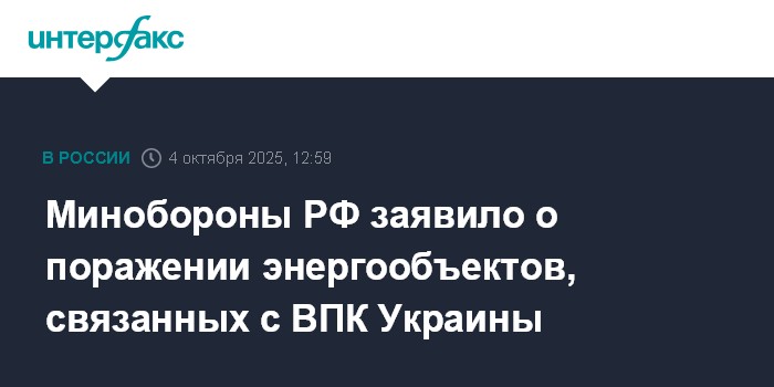 Москва. 4 октября. INTERFAX.RU - Российская армия нанесла удары по объектам энергетики, которые работают на военно-промышленный комплекс Украины, заявило Минобороны РФ в субботу.
