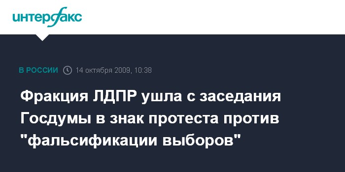 Москва. 14 октября. INTERFAX.RU - Фракция ЛДПР в полном составе покинула зал заседаний Государственной Думы в знак протеста против фальсификации результатов прошедших 11 октября выборов. "Мы не признаем эти выборы. Партия "Единая Россия" обманным путем завладела голосами избирателей, с мошенниками мы не можем находиться в одном зале", - заявил вице-спикер Госдумы, лидер ЛДПР Владимир Жириновский, после чего все депутаты этой фракции демонстративно вышли из зала заседаний.