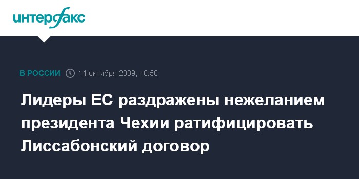 Москва. 14 октября. INTERFAX.RU - Стремление президента Чехии как можно дольше откладывать ратификацию Лиссабонского договора вызывает все большее раздражение в Европейском Союзе, пишет французская газета "Фигаро". Издание подчеркивает, что председатель Европейской комиссии Жозе Мануэл Баррозу во вторник призвал Чехию прекратить создавать "искусственные препятствия" для ратификации договора. "Чехия должна быть заинтересована в том, чтобы больше не оттягивать ратификацию", - добавил он в присутствии премьер-министра Чехии Яна Фишера.