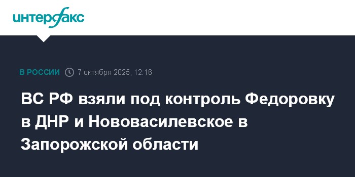 Москва. 7 октября. INTERFAX.RU - Вооружённые силы (ВС) России взяли под контроль Федоровку в ДНР и Нововасилевское в Запорожской области, сообщило министерство обороны РФ во вторник.