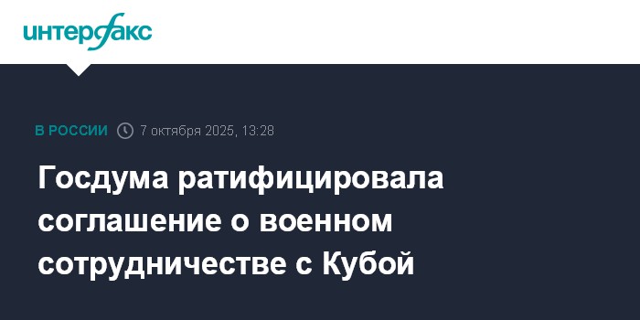 Москва. 7 октября. INTERFAX.RU - Госдума ратифицировала соглашение о военном сотрудничестве с Кубой, подписанное в Гаване 13 марта и в Москве 19 марта 2025 года.