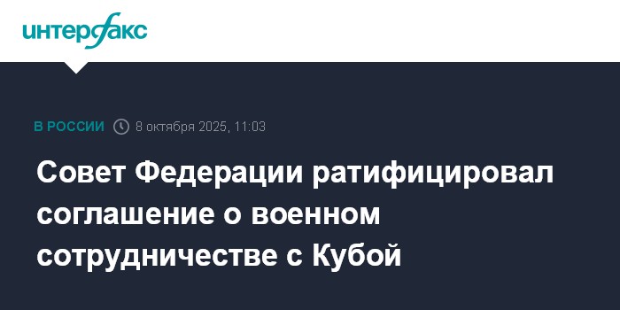 Москва. 8 октября. INTERFAX.RU - Совет Федерации на заседании в среду ратифицировал соглашение о военном сотрудничестве с Кубой, подписанное в марте текущего года в Гаване и в Москве.