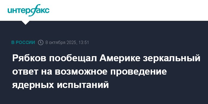 Москва. 8 октября. INTERFAX.RU - Ответ Москвы в случае принятия Вашингтоном решения о проведении ядерных испытаний будет зеркальным и не заставит себя ждать, заявил журналистам замглавы МИД РФ Сергей Рябков.