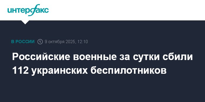 Москва. 9 октября. INTERFAX.RU - Российские военнослужащие в течение суток сбили 112 украинских беспилотников и два снаряда HIMARS, заявили в Минобороны РФ в четверг.
