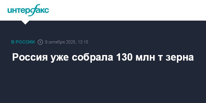 Москва. 9 октября. INTERFAX.RU - Аграрии РФ к настоящему времени собрали 130 млн тонн зерна, сообщила министр сельского хозяйства Оксана Лут на заседании оперштаба в рамках агровыставки "Золотая осень - 2025" в четверг в Москве.