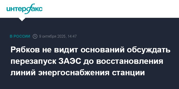 Москва. 9 октября. INTERFAX.RU - До момента восстановления линий энергоснабжения на ЗАЭС нет оснований обсуждать вопрос перезапуска станции, заявил в четверг замглавы МИД РФ Сергей Рябков.