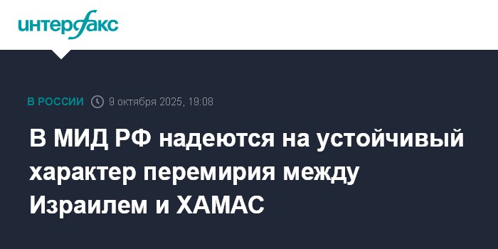 Москва. 9 октября. INTERFAX.RU - Россия приветствует договоренности между Израилем и палестинским движением ХАМАС, надеется на устойчивый характер перемирия, заявила официальный представитель МИД РФ Мария Захарова.