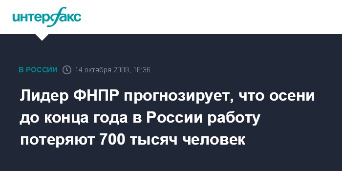 Москва. 14 октября. INTERFAX.RU - Российские работодатели, включая крупные компании, за последние полтора месяца уволили около 400 тыс. человек, к концу года могут быть уволены еще около 300 тыс. россиян, заявил председатель Федерации независимых профсоюзов России (ФНПР) Михаил Шмаков. По его оценкам, волна массовых увольнений будет продолжена до конца года. "Пожалуй, самый основной момент, который отмечен в нашем прогнозе: еще до конца года порядка 300 тыс. могут потерять работу. Таким образом, с начала осени до конца декабря, по нашим оценкам, потеряют работу порядка 700 тыс. человек", - отметил Шмаков.