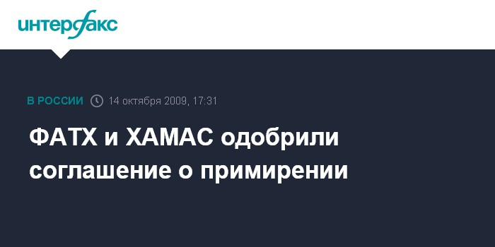 Иерусалим. 14 октября. INTERFAX.RU - Представители двух враждующих палестинских радикальных движений ФАТХ и ХАМАС утвердили соглашение о примирении с целью преодолеть политический кризис и в будущем провести новые выборы на палестинских территориях, сообщает в среду агентство ЭФЭ.
