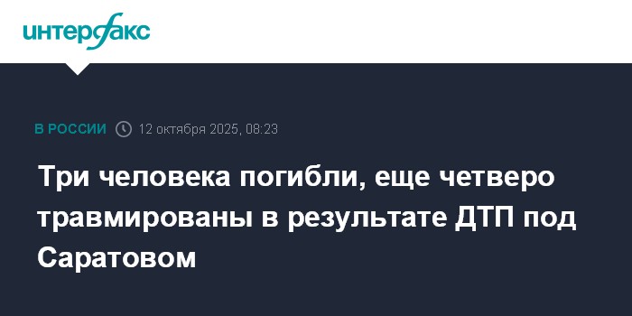 Москва. 12 октября. INTERFAX.RU - Дорожная авария в Балашовском районе Саратовской области унесла жизни троих человек, еще четверо пострадали, сообщает Госавтоинспекция региона в воскресенье в своем телеграм-канале.
