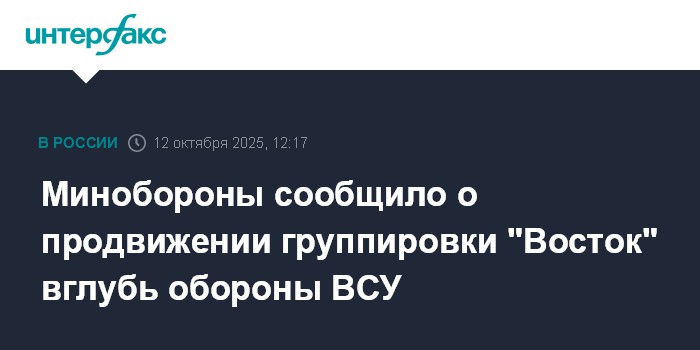 Москва. 12 октября. INTERFAX.RU - Подразделения группировки "Восток" продвигаются в глубину украинской обороны, группировки "Запад", "Центр" и "Южная" за сутки заняли более выгодные рубежи и улучшили позиции в зоне специальной военной операции, заявили в Минобороны РФ в воскресенье.