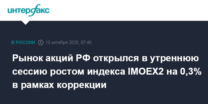 Рынок акций РФ открылся в утреннюю сессию ростом индекса IMOEX2 на 0,3% в рамках коррекции