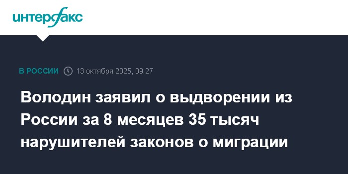 "Месяц назад, 10 сентября, истек срок пребывания в нашей стране иностранных граждан, сведения о которых включены в реестр контролируемых лиц - базу данных о мигрантах, незаконно находящихся на территории Российской Федерации, - написал он. - Федеральной службой судебных приставов за 8 месяцев 2025 года за пределы нашей страны выдворено около 35 тысяч иностранных граждан, нарушивших миграционное законодательство".