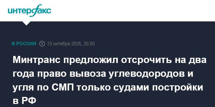 Москва. 13 октября. INTERFAX.RU - Минтранс РФ предлагает перенести на март 2028 года вступление в силу ограничений экспортных перевозок углеводородов и угля по Северному морскому пути только морскими судами, построенными на территории РФ.