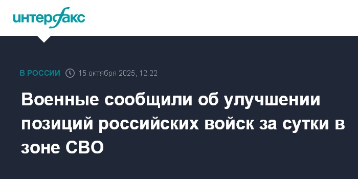 Москва. 15 октября. INTERFAX.RU - Подразделения группировок войск "Север", "Запад" и "Южная" улучшили положение, заняли более выгодные рубежи в зоне проведения специальной военной операции, заявили в Минобороны России в среду.
