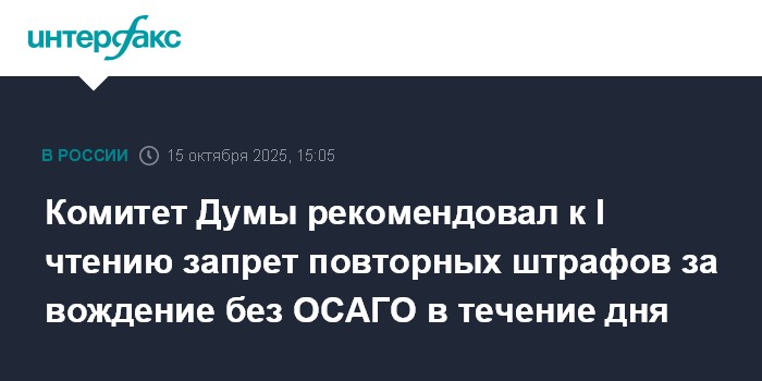 Москва. 15 октября. INTERFAX.RU - Комитет Госдумы по финансовому рынку рекомендовал принять в первом чтении законопроект о запрете повторных штрафов в течение дня за вождение без полиса ОСАГО. Об этом сообщил глава комитета Анатолий Аксаков.