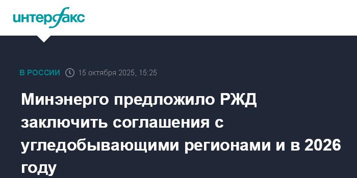 Москва. 15 октября. INTERFAX.RU - Минэнерго рассчитывает на заключение РЖД соглашения с угледобывающими регионами о гарантированном объеме вывоза угля на 2026 год, прежде всего с Кузбассом, заявил журналистам в кулуарах РЭН-2025 замминистра энергетики Дмитрий Исламов.
