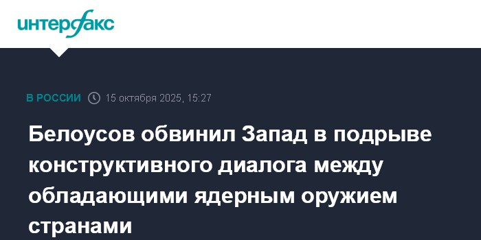 Москва. 15 октября. INTERFAX.RU - Министр обороны России Андрей Белоусов заявил, что действия Запада являются причиной утраты основ конструктивного диалога между обладающими ядерным оружием государствами.
