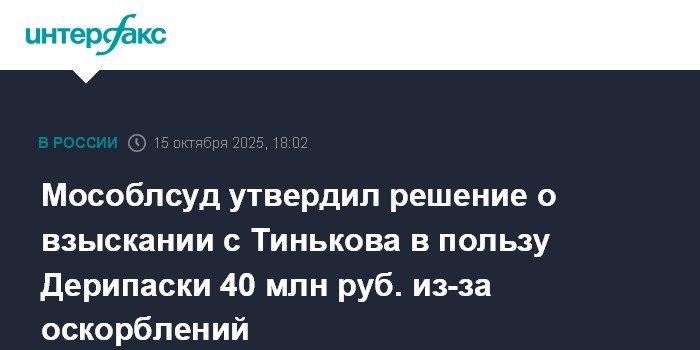 Мособлсуд утвердил решение о взыскании с Тинькова в пользу Дерипаски 40 млн руб. из-за оскорблений