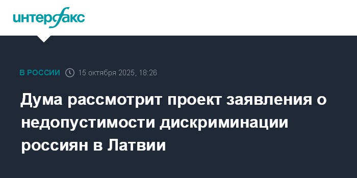 Москва. 15 октября. INTERFAX.RU - Заявление Государственной думы о недопустимости дискриминационной политики Латвии в отношении российских граждан будет рассмотрено на пленарном заседании в четверг, сообщили в пресс-службе Госдумы.
