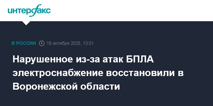 Москва. 16 октября. INTERFAX.RU - Возобновлено электроснабжение ряда населенных пунктов Воронежской области, прерванное в результате атак украинских беспилотников, сообщает пресс-служба правительства региона в четверг.