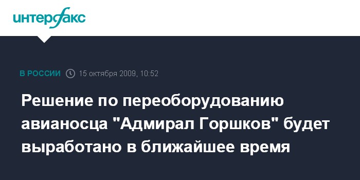 Москва. 15 октября. INTERFAX.RU - Взаимоприемлемое решение по вопросам ремонта и переоборудования тяжелого авианесущего крейсера (ТАВКР) "Адмирал Горшков" для индийских Военно-морских сил будет выработано в ближайшее время, заявляют в российском оборонном ведомстве. "Стороны договорились выработать в ближайшее время взаимоприемлемое решение по вопросам ремонта и переоборудования ТАВКР "Адмирал Горшков" в интересах индийских ВМС. Они также пришли к соглашению решить до конца 2009 года все организационные вопросы, касающиеся совместной разработки перспективного многофункционального истребителя и приступить к практической работе по его созданию", - сказано в сообщении управления пресс-службы и информации МО РФ, распространенном по результатам работы 9-го заседания российско-индийской межправкомиссии по ВТС, которая завершила работу в Москве в четверг.