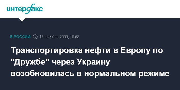 Москва. 15 октября. INTERFAX.RU - Транспортировка нефти в Европу по нефтепроводу "Дружба" через Украину возобновилась в нормальном режиме, сообщил Агентству нефтяной информации (АНИ) пресс-секретарь АК "Транснефть" Игорь Демин. "Прокачка в Европу возобновилась 14 октября в 22:00 МСК. В настоящее время нефть транспортируется в Европу и по участку Броды-Одесса в обычном режиме. Если не будет повторных остановок, то все заявленные объемы будут прокачаны", - сказал он.