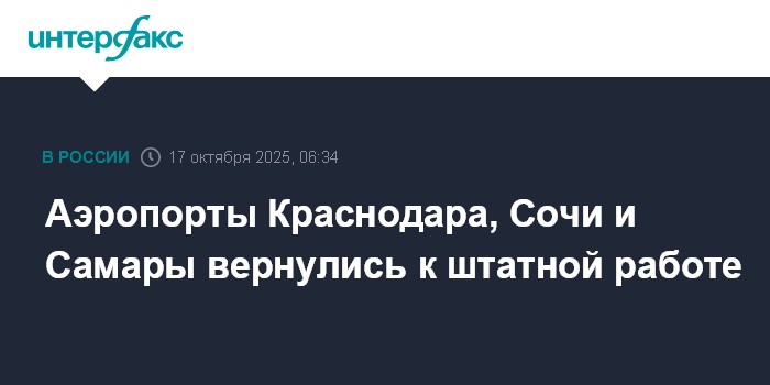 Москва. 17 октября. INTERFAX.RU - Аэропорты Краснодара и Сочи возобновили обслуживание рейсов, сообщил в своем телеграм-канале представитель Росавиации Артем Кореняко.