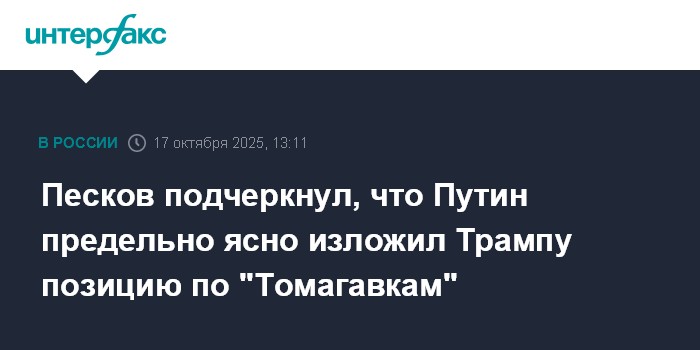 Отвечая на уточняющий вопрос, касающийся того, сократил ли угрозу поставок "Томагавков" на Украину телефонный разговор Путина и Трампа, Песков сказал: "Наверное, это нужно спрашивать наших американских визави".
