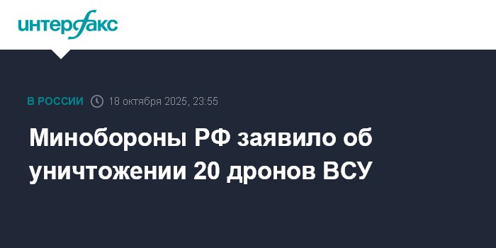 Москва. 18 октября. INTERFAX.RU - Двадцать украинских беспилотников самолетного типа сбиты над российскими регионами в субботу с 21:00 до 23:00 по Москве, сообщило Минобороны РФ.