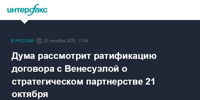 Москва. 20 октября. INTERFAX.RU - Госдума рассмотрит 21 октября законопроект о ратификации договора между Россией и Венесуэлой о стратегическом партнерстве и сотрудничестве, сообщил через пресс-службу Думы спикер палаты Вячеслав Володин после заседания Совета Думы.