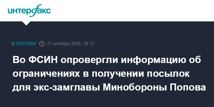 Москва. 21 октября. INTERFAX.RU - В федеральной службе исполнения наказаний заявили о недостоверности распространяемой в СМИ информации о якобы ограничениях в получении посылок бывшим замминистра обороны генералом Павлом Поповым, содержащимся в СИЗО по обвинению в коррупции.