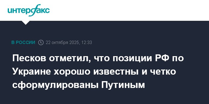 Москва. 22 октября. INTERFAX.RU - Позиции России по украинскому вопросу всем хорошо известны, они четко сформулированы президентом РФ Владимиром Путиным, сообщил его пресс-секретарь Дмитрий Песков.
