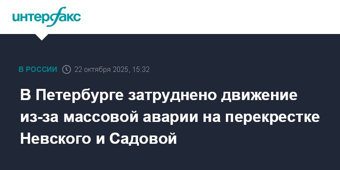 Москва. 22 октября. INTERFAX.RU - В центре Петербурга на Невском проспекте образовался затор из-за столкновения нескольких машин на перекрестке проспекта с Садовой улицей, передал корреспондент "Интерфакса".
