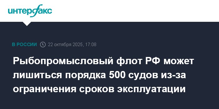 Москва. 22 октября. INTERFAX.RU - Принудительные ограничения сроков эксплуатации судов по возрасту могут привести к выбытию порядка 500 судов рыбопромыслового флота РФ, сообщил руководитель Росрыболовства Илья Шестаков.