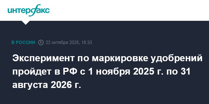 Москва. 22 октября. INTERFAX.RU - Пилотный проект по маркировке удобрений в потребительской упаковке в системе "Честный знак" пройдет на территории РФ с 1 ноября 2025 года по 31 августа 2026 года. Соответствующее постановление утвердило правительство РФ.