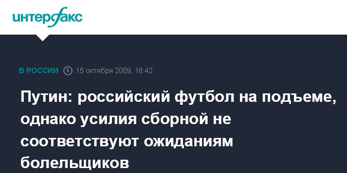 Москва. 15 октября. INTERFAX.RU - Игра российской сборной по футболу не соответствует ожиданиям болельщиков страны, заявил премьер-министр РФ Владимир Путин.