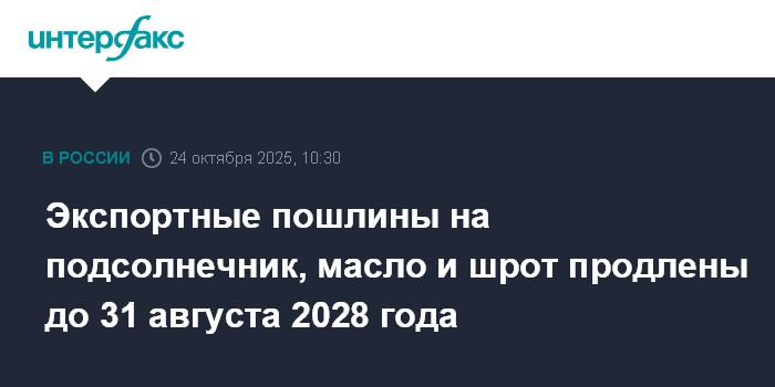 Москва. 24 октября. INTERFAX.RU -Правительство приняло постановление о продлении до 31 августа 2028 года срока действия экспортных пошлин на подсолнечник, подсолнечные масло и шрот, сообщает сайт кабинета министров.