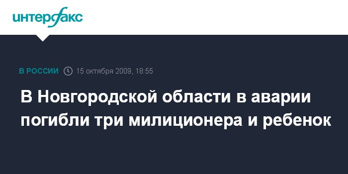 Великий Новгород. 15 октября. INTERFAX.RU - На трассе под Великим Новгородом в аварии погибли трое сотрудников милиции и мальчик, сообщили "Интерфаксу" в областном отделении ГИБДД.