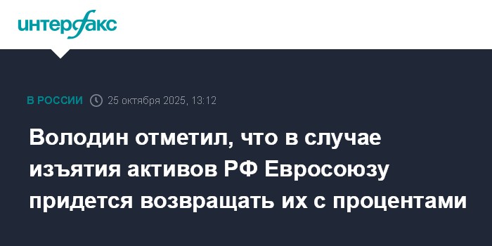 Москва. 25 октября. INTERFAX.RU - Российские замороженные активы в случае их изъятия европейскими странами придется возвращать с процентами, заявил председатель Госдумы Вячеслав Володин.