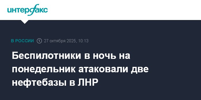 Москва. 27 октября. INTERFAX.RU - Вооруженные силы Украины в ночь на понедельник атаковали с применением ударных беспилотников две нефтебазы в Луганской Народной Республике, сообщили в министерстве топлива, энергетики и угольной промышленности региона.