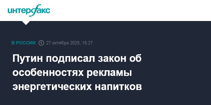 Москва. 27 октября. INTERFAX.RU - Президент РФ Владимир Путин подписал закон об установлении особенностей рекламы безалкогольных тонизирующих напитков, в том числе энергетических.