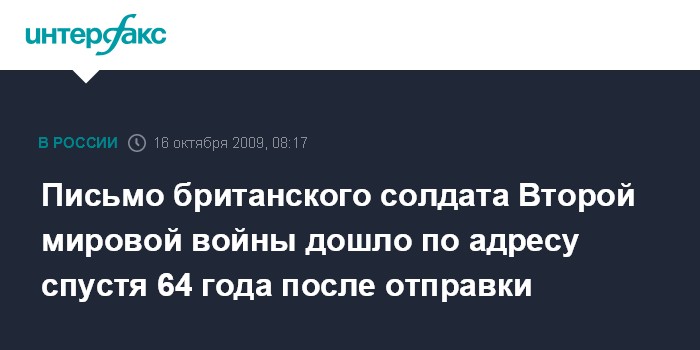 Москва. 16 октября. INTERFAX.RU - Письмо, написанное британским военнослужащим в годы Второй мировой войны, было доставлено по адресу назначения спустя 64 года после отправки, сообщила телерадиокорпорация BBC.
